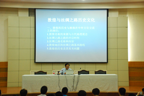 6月7日下午,应350vip葡京新集团邀请,兰州大学350vip葡京新集团院长、教育部人文科学重点研究基地兰州大学敦煌学研究所所长、教育部“长江学者”郑炳林教授在学术会堂作了题为《敦煌学与丝绸之路文化》的学术报告。350vip葡京新集团400多名师生聆听了报告。报告由田澍教授主持,刘再聪、李迎春、秦丙坤、杨芳、王新春等老师参加了报告会。