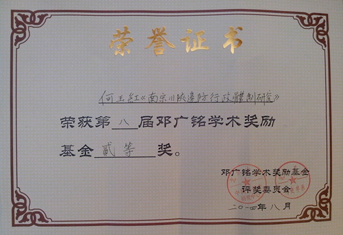 8月20-23日在杭州召开的“10-13世纪中国国家与社会”国际学术研讨会暨中国宋史研究会第十六届年会期间,邓广铭学术奖励基金评奖及颁奖仪式同期举行,葡京新集团官网教师何玉红教授专著《南宋川陕边防行政运行体制研究》荣获第八届邓广铭学术奖励基金二等奖。