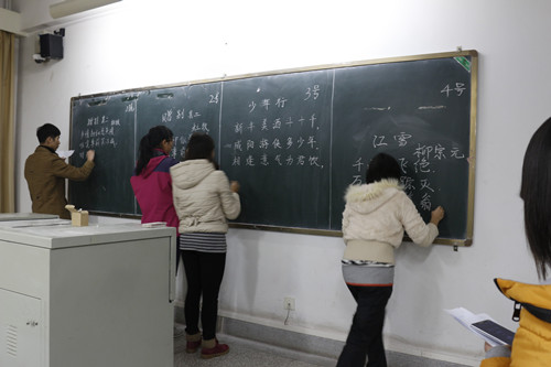 本届三笔字大赛自组织报名以来受到了全院学生的广泛关注,各级各班同学踊跃参赛。比赛当日,现场秩序井然,在粉笔字、毛笔字的比赛现场,同学们屏气凝神,专注于笔下;钢笔字比赛现场,同学们按照比赛要求,认真书写。最终,经由葡京新集团官网尚季芳老师、黄兆宏老师以及由学生代表组成的评委会的评议,王保云、陈弘毅、徐东明等同学获得优胜奖。