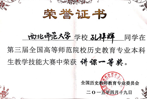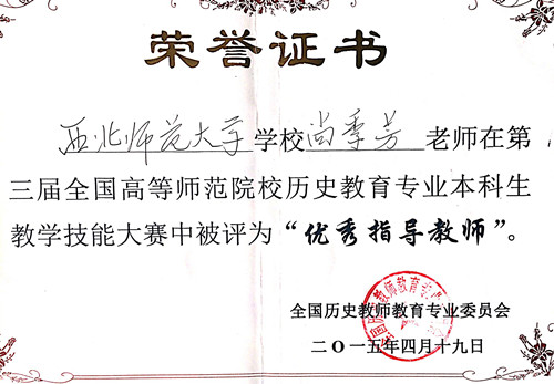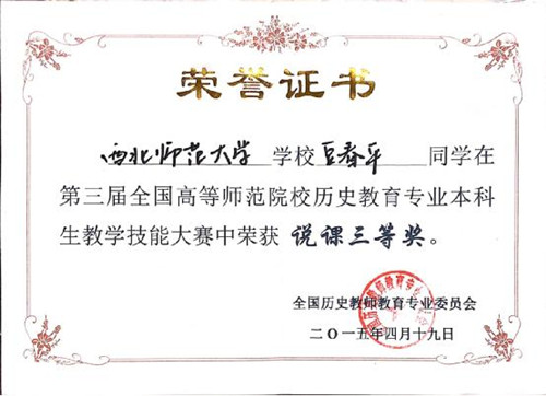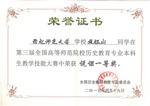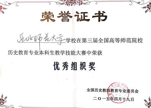 2015年4月17-19日,第三届全国高等师范院校历史教育专业本科生教学技能大赛在西南大学举行。来自华东师大、东北师大、首都师大、华中师大、陕西师大、西南大学和西北师大等56所高师院校的160名学子参加了此次比赛。葡京新集团官网获优秀组织奖,尚季芳教授获优秀指导教师,代表我校参赛的3名本科生全部获奖,其中孔祥辉获讲课一等奖,段钰山获说课一等奖,豆春萍获说课三等奖,为我校此次参赛交上了一份满意的答卷。