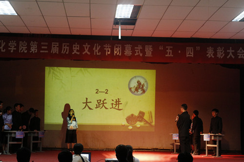 闭幕式上进行了本届历史文化节历史知识竞赛决赛,经过“初露锋芒”、“大浪淘沙”、“心有灵犀”、“一战到底”四个环节的激烈比拼,最终由来自350vip葡京新集团的石恒伍,邓康康和来自地理与环境学院的刘海洋组成的“凌云舒雨”队获得本届历史知识竞赛的冠军。在随后的“五·四”表彰环节中,学院领导分别为本届知识竞赛的获胜队伍,学院“五·四”优秀集体和个人进行了授奖表彰。
