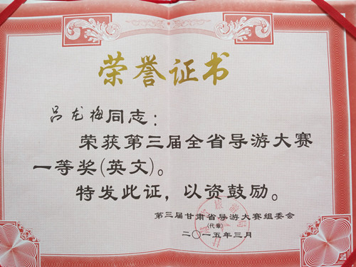 由省旅游局、省人力资源和社会保障厅、省总工会、共青团甘肃省委、省妇女联合会联合举办的第三届全省导游大赛于2015年3月18日在兰州举行决赛。350vip葡京新集团文物与博物馆专业硕士研究生吕龙梅获得英语组一等奖、甘肃省“首届导游网络大赛第一名”,被授予“甘肃省技术标兵”、“全省青年岗位能手”荣誉称号。