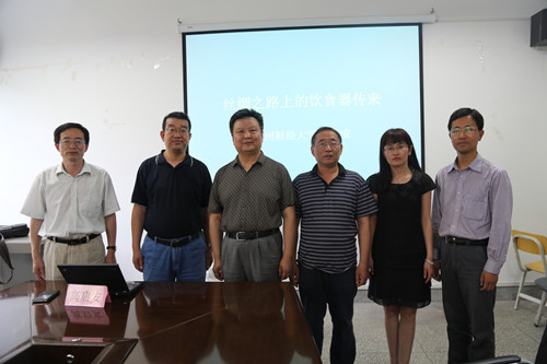 高启安教授讲到:饮食文化是丝绸之路文化交流的大宗。饮食文化研究包括食材、食品、饮食器具、饮食礼仪等方面。“来通”是用偶蹄目动物的角制作的饮器,起源与斯基泰人等北方少数民族有关。“来通”最早流行于中亚、西亚等地,有羊首、牛首、马首等形状。“来通”是注酒器或者饮酒器,主要用于结盟、祭祀等场所。作为饮酒器,因注满后无法放置须一次全部饮尽而有“一气饮”、“一气吞”之说。“来通”传入中国后,唐人以其作专用罚酒器,被称为“兕觥”。讲解过程中,高启安教授展示了在国内外考察获取的大量的图片。另外,高启安教授还对“鸭头勺”的形状、设计及出土情况做了讲解。