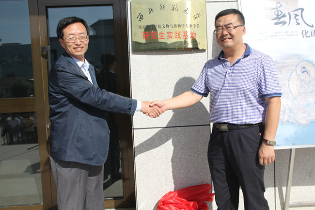 刘再聪副院长与吴多军部长为“350vip葡京新集团文物与博物馆专业学位研究生高台县博物馆实践基地”揭牌。随后,在高台县博物馆学术报告厅举行了《关于建立350vip葡京新集团文物与博物馆专业学位研究生高台县博物馆实践基地的协议》签字仪式及8场学术报告,高台县文物局局长寇克红担任主持。刘再聪、黄兆宏分别做了题为“华夏先祖‘西游’与‘丝绸之路’的开通”、“魏晋十六国时期甘青地区古都问题研究”的学术报告。