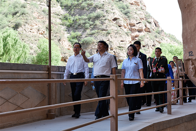 参观途中,南德•巴哈杜尔•普恩副总统一行认真了解甘肃石窟的状况,对炳灵寺石窟悠久的历史文化,精美的佛教艺术造像非常感兴趣,询问炳灵寺建造的历史背景及相关情况,马佳俐认真细致地一一作了解说。进入窟区,南德•巴哈杜尔•普恩副总统在第8窟、第171窟前不停驻足观看,并听取讲解员马佳俐的解说,在第169窟前感叹中国古代人民的伟大,并对169窟保存的精美壁画赞不绝口。南德•巴哈杜尔•普恩副总统还对炳灵寺石窟在丝绸之路、唐蕃古道上发挥的重要作用进行了深入了解,并对马佳俐的讲解非常满意。