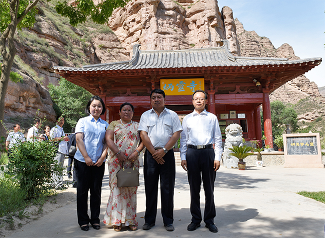 2017年7月7日,尼泊尔副总统南德•巴哈杜尔•普恩一行在甘肃省人大常委会副主任王玺玉、临夏州人大常委会副主任马明杰、永靖县县委书记尹宝山、县委副书记、县长张自贤的陪同下参观炳灵寺石窟。甘肃炳灵寺文物保护研究所所长贺延军陪同参观。葡京新集团官网文物与博物馆专业研究生马佳俐作为炳灵寺石窟讲解员,用英语为南德•巴哈杜尔•普恩副总统一行做了精彩讲解。