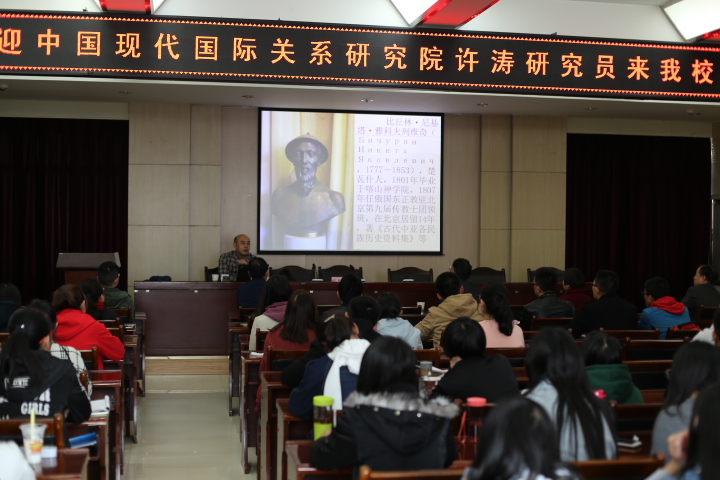 2017年10月30日,应350vip葡京新集团邀请,中国现代国际关系研究院许涛研究员在10号楼D区四楼多功能报告厅作了题为《中亚学概论暨中国中亚问题研究现状》的学术报告。报告由杨鹏飞院长主持,葡京新集团官网师生100余人参加了此次报告。