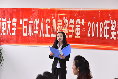 陈艺丹同学代表受助学生感谢日本华人企业家的帮助。她表示,将一定珍惜大学时光,脚踏实地,努力拼搏,在完成学业的同时,努力提升各方面的素质和修养,将来成为一名合格的社会公民,在实现自身价值的同时,努力回报日本华人企业家的支持与鼓励。