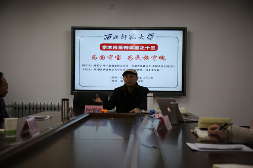 20181225日,中国收藏家协会会员、甘肃省收藏家协会彩陶委员会副会长钟爱亭老师在7号楼314会议室做了题为《为国守宝 为民族守魂》的学术报告。报告会由刘再聪教授主持,马军霞、张之佐、鲁宸伊等老师及研究生、本科生60多人参加了报告会。