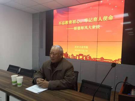 学院举行“不忘教育初心 牢记育人使命——师德师风大家谈”活动,特别邀请81岁高龄的退休教师侯丕勋教授为学院全体教师和学生代表进行了专题讲座。侯丕勋教授从自己如何在金宝祥、马正林等学院上一代教师指导下进入历史学研究门径、如何为师治学谈起,就正确史学观念的树立、历史学学术研究中应追求的目标、历史学研究的宏观与微观、史学论文的写作技巧等问题展开深入分析。报告朴实无华、严谨求实,获得了广大师生员工的一致好评。