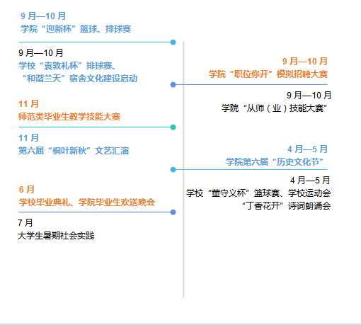 “历史文化节” | 4月—5月 | 学院特色类校园文化活动,包括历史知识竞赛、历史专题讲座、历史小剧场、历史图片展、历史电影展映等系列活动 |