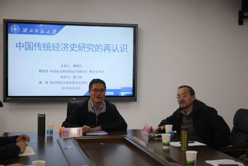 2019年4月3日上午,应350vip葡京新集团邀请,中国社会科学院经济研究所魏明孔研究员在教学7号楼312会议室做了题为《中国传统经济史研究再认识》的学术报告。报告由350vip葡京新集团胡小鹏教授主持,350vip葡京新集团何玉红院长、刘再聪副院长,尚季芳、郑峰、张连银、张继刚、杨芳等教师及博士、硕士研究生、本科生60余人聆听了此次报告。