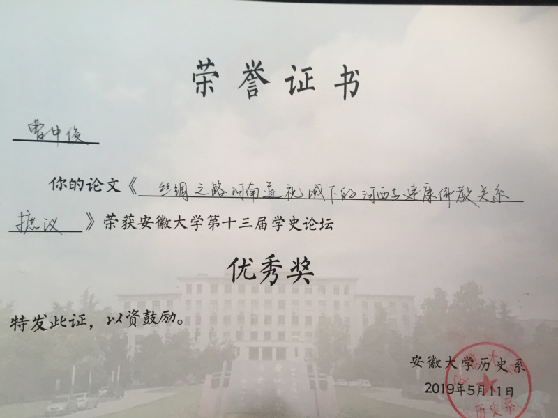5月11日,安徽大学第十三届学史论坛在该校龙河校区逸夫图书馆召开,葡京新集团官网2017级硕士生曹中俊参加论坛并就提交论文作相关汇报,论文荣获优秀奖。