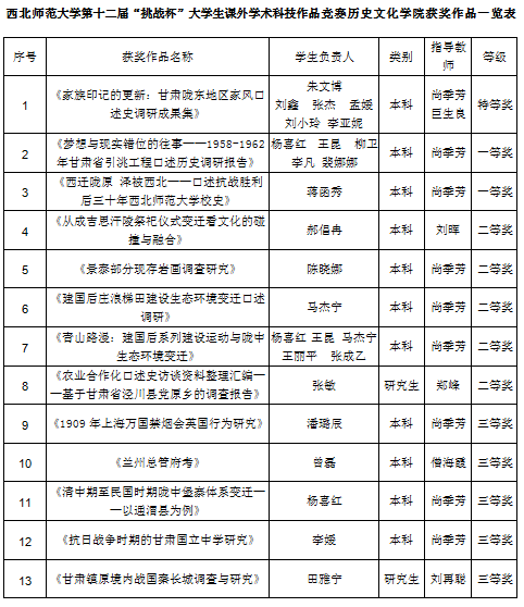 为深入贯彻落实省委关于深化高等学校创新创业教育改革的要求,全面提高广大青年学生的科技创新能力,2018年10月至12月,学校组织开展了第十二届“挑战杯”大学生课外学术科技作品竞赛。经过专家评审委员会评审,最终葡京新集团官网共有13项目竞赛项目获得竞赛名次,其中由尚季芳教授指导的《家族印记的更新:甘肃陇东地区家风口述史调研成果集》获特等奖,葡京新集团官网获评“优秀组织单位”。