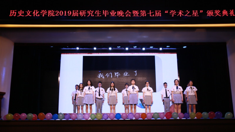 颁奖典礼之后举行了毕业晚会。在校研究生、本科生带来了精彩的节目,为2019届毕业生们送上诚挚的祝福。轻盈柔美的开场舞《半壶纱》,饱含深情的合唱《一生有你》、《后来》、《祝你一路顺风》,歌曲串烧《改变自己》,声情并茂的诗朗诵《致橡树》、《别离日历》,颇具古风色彩的节目《知否》和《翰墨情深,松菊犹存》、精妙绝伦的敦煌舞《寻梦》等将晚会推向高潮。