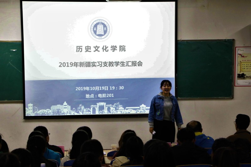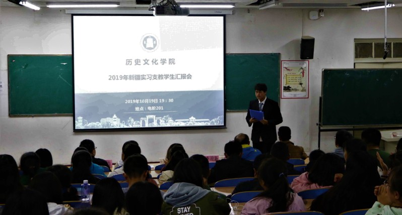 为扎实推进“不忘初心、牢记使命”主题教育的开展,2019年10月19日晚,学院在电阶201教室举办了2019年春季学期赴新疆支教实习学生汇报会。学院党委副书记柴蓉老师,僧海霞老师,以及辅导员张国源老师,王浩老师,曾磊老师参加了此次汇报会。在当晚的汇报会中,共有2016级14位赴新疆支教的学生为参会师生分享了他们各自在新疆支教实习期间的经历。