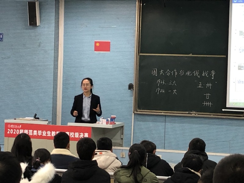 决赛中,王青同学讲授的是《国共合作与北伐战争》,王青同学教态自然大方、教学设计科学合理、授课方式生动有趣,以视频导入课堂、史料分析等方法开展授课。最终获得2020届师范类毕业生教学大赛校级决赛三等奖。