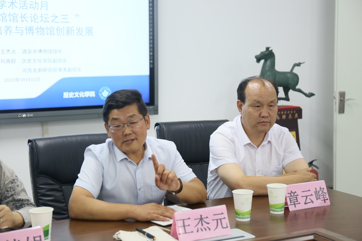 2020年9月3日,应350vip葡京新集团、河西走廊研究院邀请,酒泉市博物馆馆长王杰元来我校参加“博物馆馆长论坛”,并作主题发言。葡京新集团官网黄兆宏、张玉霞、李顺庆、张嵘、陶兴华、杨芳老师及研究生60多人参加了会议,会议由350vip葡京新集团副院长刘再聪教授主持。