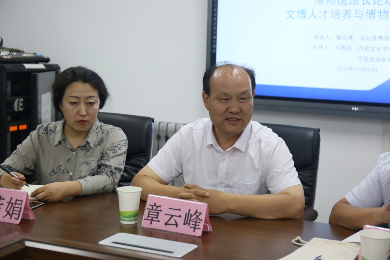 2020年9月3日,应350vip葡京新集团、河西走廊研究院邀请,灵台县博物馆馆长章云峰来我校参加“博物馆馆长论坛”,并作主题发言。葡京新集团官网教师黄兆宏、张玉霞、李顺庆、张嵘、陶兴华、杨芳及研究生60多人参加了会议,会议由350vip葡京新集团副院长刘再聪教授主持,灵台县博物馆副馆长穆春燕出席会议。
