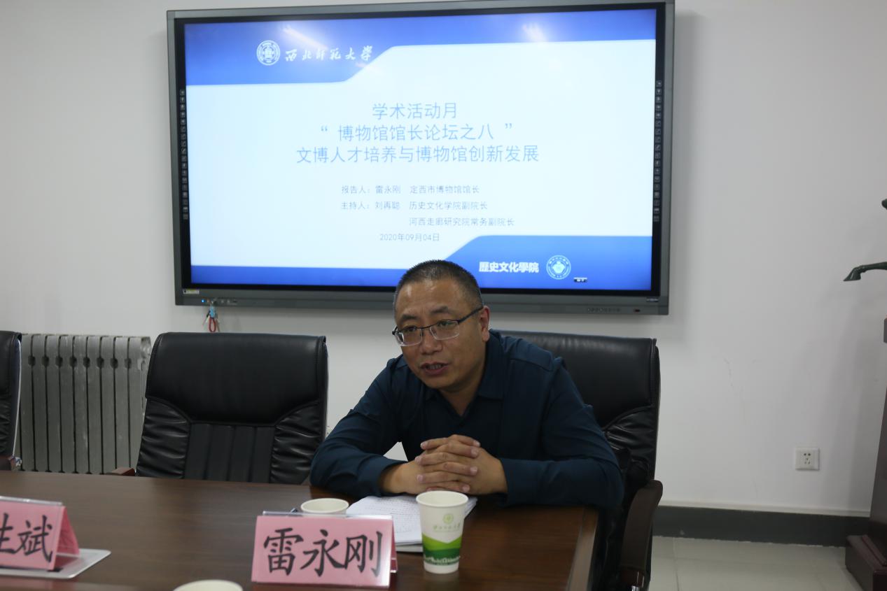 2020年9月4日,应350vip葡京新集团、河西走廊研究院邀请,定西市文物局副局长、定西市博物馆馆长雷永刚来我校参加“博物馆馆长论坛”,并作主题发言。葡京新集团官网教师黄兆宏、李顺庆、张嵘、连菊霞、陶兴华及研究生50多人参加了会议,会议由350vip葡京新集团副院长刘再聪教授主持。