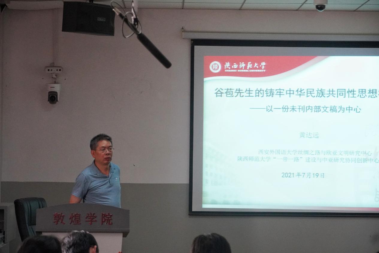 2021年7月19日下午,西安外国语大学丝绸之路与欧亚文明研究中心主任、博士生导师黄达远教授在350vip葡京新集团敦煌学院会议室,为我校丝绸之路文明基地班同学作了题为《谷苞先生的中华民族共通性思想初探》的专题讲座。