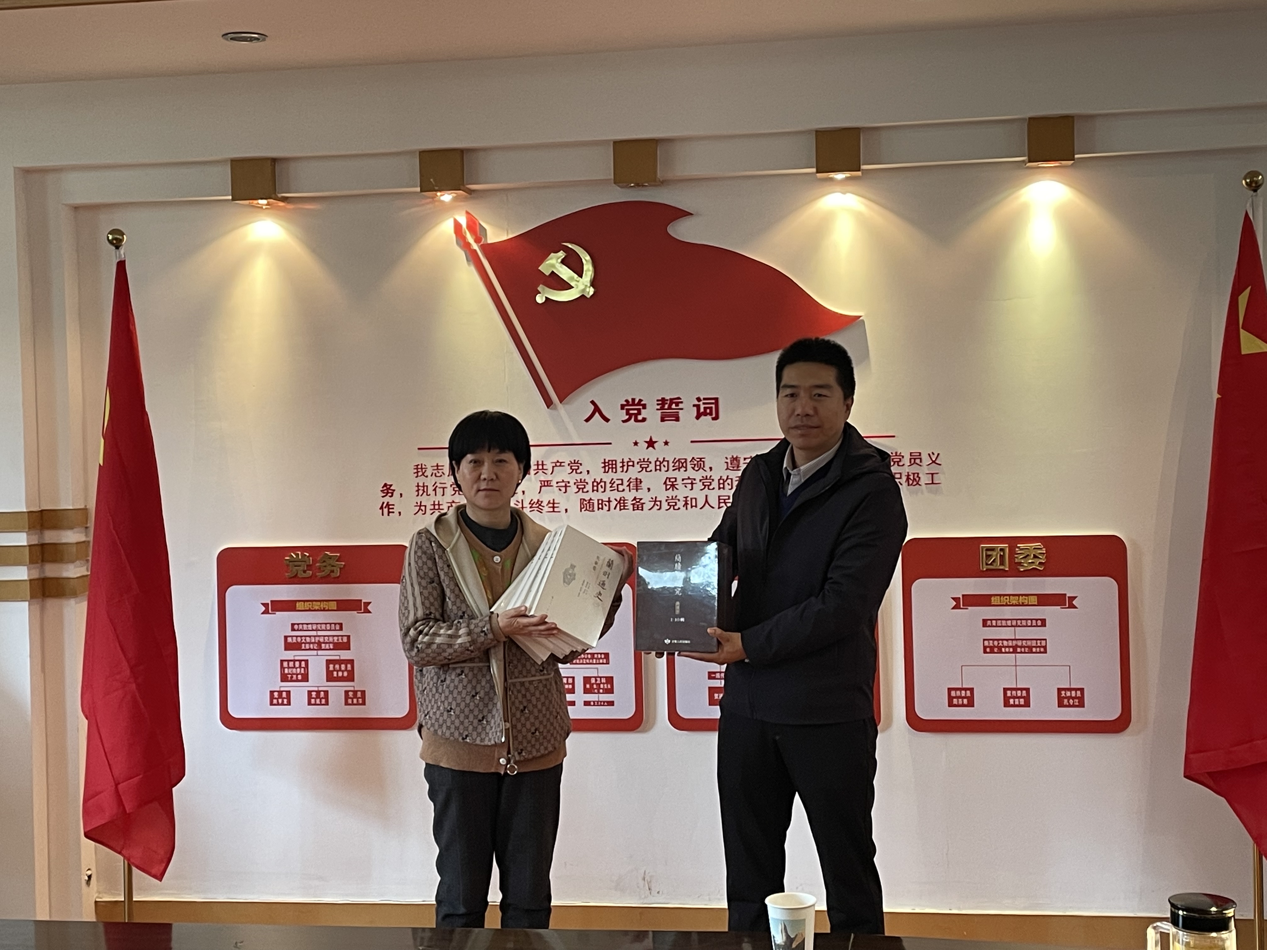 康智杰书记为炳灵寺文物保护研究所授牌、张继刚副院长赠送《简牍学研究》《兰州通史》等书籍。