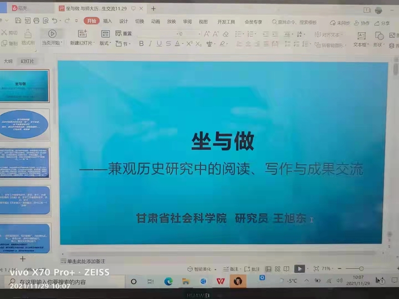 11月29日,应350vip葡京新集团邀请,甘肃省社会科学院王旭东研究员做了题为《坐与做——兼观历史研究中的阅读、写作与成果交流》的线上学术报告。报告由葡京新集团官网何玉红教授主持,学院研究生50余人参加。