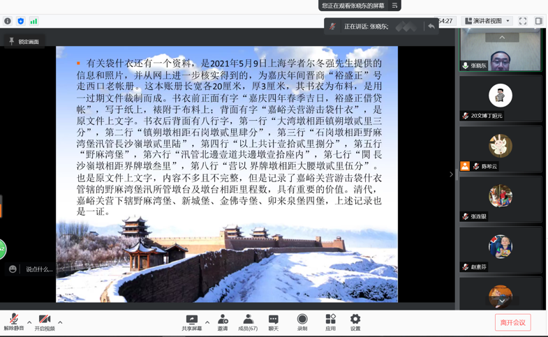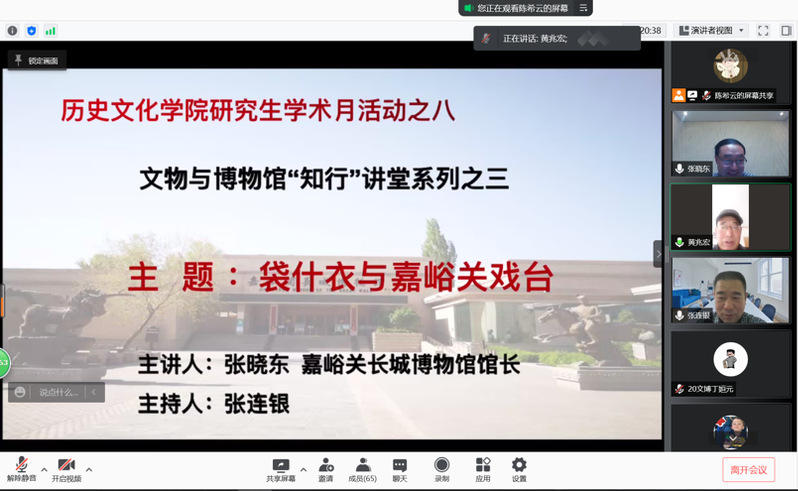 2021年12月7日下午,嘉峪关长城博物馆馆长张晓东应350vip葡京新集团邀请,作了题为《袋什衣与嘉峪关戏台》的线上学术报告。报告会由350vip葡京新集团教授张连银主持,葡京新集团官网教师黄兆宏及80余名研究生在线参加了报告会。