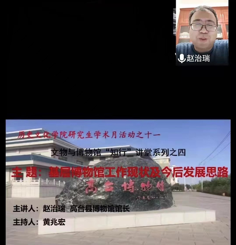 2021年12月10日下午,高台县博物馆馆长赵治瑞应350vip葡京新集团邀请,作了题为《基层博物馆工作现状及今后发展思路》的线上学术报告,报告会由350vip葡京新集团文物与博物馆教育中心主任黄兆宏主持,葡京新集团官网教师秦丙坤、张嵘、杨芳、李顺庆及80余名研究生在线参加了报告会。