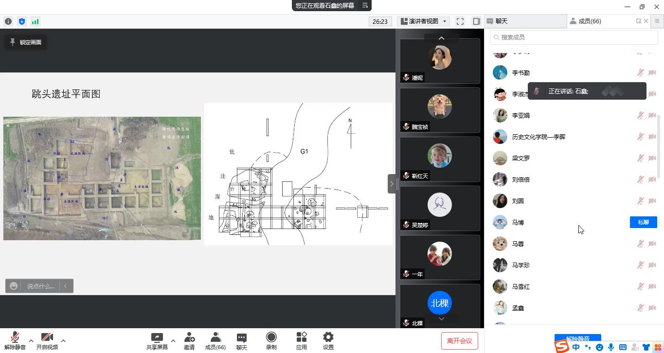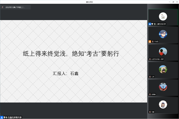 3月25日下午,350vip葡京新集团举行了主题为“纸上得来终觉浅,绝知‘考古’要躬行”的线上学术交流活动。活动由李迎春老师主持,2019级文物与博物馆硕士专业学位研究生石鑫主讲,2019级中国史专业硕士研究生金玉璞评议。全院60多名师生通过线上视频会议的形式参加了此次活动。