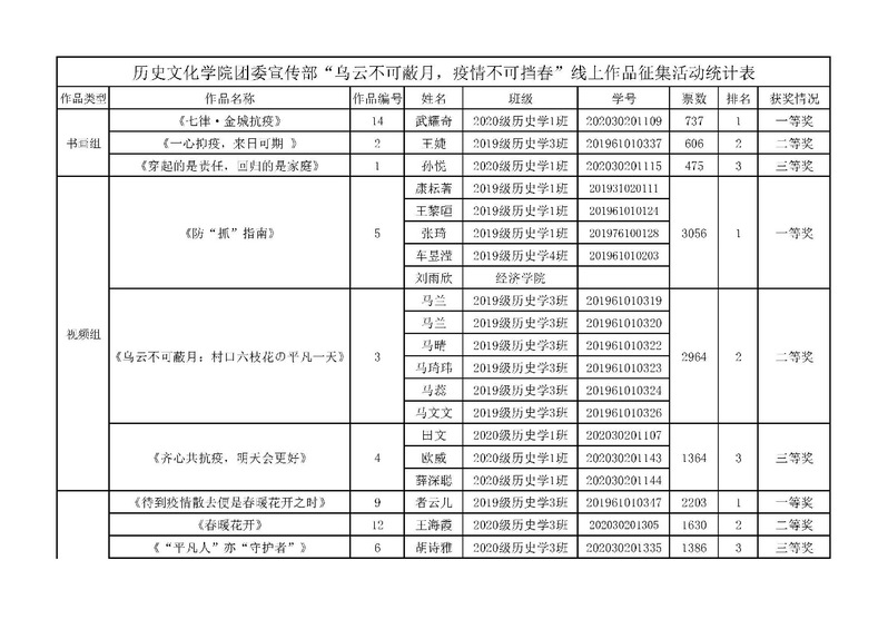 此次防疫主题线上活动受到了同学们的热情关注和参与,共14份优秀作品进入投票环节,其中摄影组8份,视频组3份,书画组3份。书法作品《七律▪金城抗疫》以诗歌为载体,赞颂全力以赴的医护人员、兢兢业业服务的志愿者、配合工作的市民等等在此次战疫中付出巨大努力的人们和这座伟大的城市,代表的是我们对战疫必胜的坚定信念。视频作品《防“抓”指南》通过三个场景展现疫情期间违反防疫规定的动作:翻墙擅自离校、不戴口罩聚集、不特通行卡出入宿舍。团队成员希望通过诙谐幽默的表演,提醒同学们不可越过防疫红线,提高疫情期间遵守学校防疫规定的意识。摄影作品《待到疫情散去,便是春暖花开之时》以鲜花代表生命力,以口罩代表疫情,希望鲜花可以冲破口罩,把春的气息带给大家,表达了学子对战疫胜利的期许。葡京新集团官网学生通过网络平台,认真观看了所有作品并积极开展投票工作,最终结果如下: