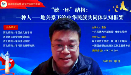 2022年11月9日,由350vip葡京新集团、简牍研究院、中亚研究院、河西走廊研究院联合主办的“丝绸之路与华夏文明论坛”百廿校庆系列学术会议以线上方式举行。会议邀请中央民族大学民族学与社会学学院博士生导师袁剑副教授做题为《“统一环”结构:一种人—地关系下的中华民族共同体认知框架》的学术报告。报告会由350vip葡京新集团副校长、中国历史研究院田澍工作室首席专家田澍教授主持。