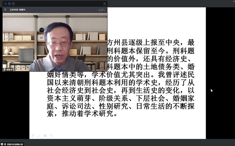2022年11月23日下午,南开大学中国社会史研究中心常建华教授应350vip葡京新集团邀请,作了题为《再谈清朝刑科题本与新史学》的线上学术报告,报告会由350vip葡京新集团院长刘再聪教授主持,葡京新集团官网教师尚季芳、张嵘及200余名研究生和本科生在线听讲。