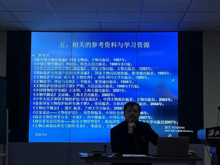 报告伊始,张东老师先对国家及政府有关部门制定的关于文物与博物馆的法律、法令、条例和规定等进行详细介绍,以此开阔同学们的视野,拓展学习者的思维,使被授课人的知识层面更加丰富,知识体系更加笼统;其次,以遗址墓葬发掘和保护管理为轴线,探索文化遗产可持续保护管理的全新路径;最后,又以甘肃省文物保护工作为例,图文并茂、口述一体,详细科普甘肃文物保护工作的发展历史。