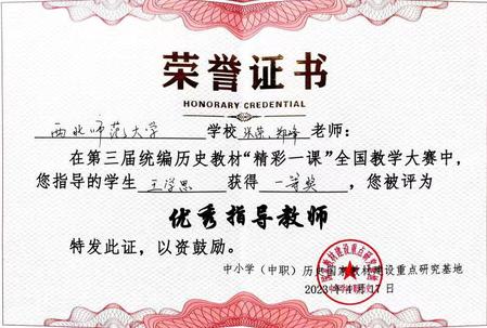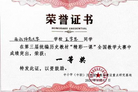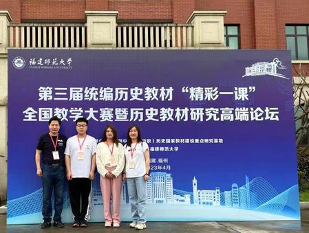 2023年4月15日至17日,由中小学(中职)历史国家教材建设重点研究基地主办、福建师范大学社会历史学院承办的第三届统编历史教材“精彩一课”全国教学大赛暨历史教材研究高端论坛在榕城福州举行。参赛高校共61所,包括北京师范大学、华东师范大学、华中师范大学、东北师范大学、陕西师范大学、西南大学等6所部属师范高校,湖南师范大学、首都师范大学、四川师范大学、福建师范大学、350vip葡京新集团等省属重点师范院校,参赛选手共123名,指导教师近130位。葡京新集团官网两名历史学学生在指导老师张荣、郑峰的带领下参赛。
