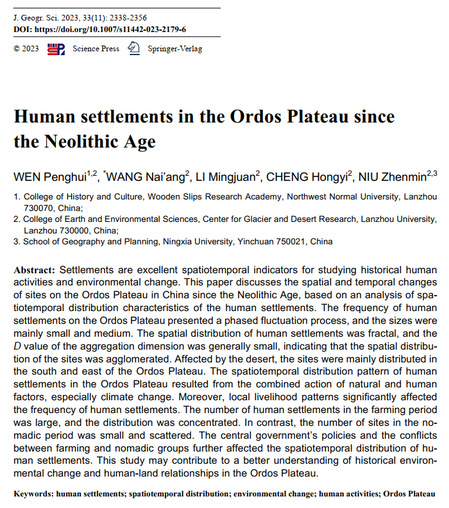 近日,葡京新集团官网青年教师温鹏辉博士以第一作者身份发表题为“Human settlements in the Ordos Plateau since the Neolithic Age”(新石器时代以来鄂尔多斯高原人类活动遗址研究)的研究成果。该论文发表于地理学著名期刊《Journal of Geographical Sciences》,该期刊最新SCI影响因子为4.9,近10年连续被评为“中国最具国际影响力学术期刊”。论文通讯作者为兰州大学王乃昂教授,兰州大学程弘毅副教授、博士研究生李明娟及宁夏大学牛震敏博士为文章合作作者。