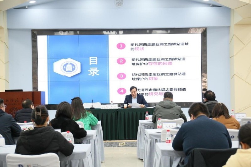 田澍副校长首先介绍了2018-2023年之间带领团队对明代丝绸之路驿站现状的调查结果,总结了目前驿站遗址保护中存在的三点问题:一、保护意识淡薄、遗产保护宣传不够;二、文物管理部门职责不清,其原因在保护管理措施不到位、基层从业人员缺乏专业培训、驿站保护级别不一、文物保护经费不足;三、碑文书写不规范。其次,并根据以上问题提出了相应的对策:一、要成立专门保护的领导小组,全面掌握地区驿站遗存情况,分类制定保护方案;二、加强文物保护人才培养和文化站管理职能,与相关高校合作,建立文物保护培训基地。最后,他对明代所丝绸之路驿站遗址保护的研究和利用提出了四点建议:一、加强明代河西走廊丝绸之路驿站遗存的整体性保护与利用;二、加大文化遗产价值的宣传,增强民众的文物保护意识;三、打造河西走廊驿站文化精品旅游线路;四、建立跨区域(省、市、县)合作运行机制。