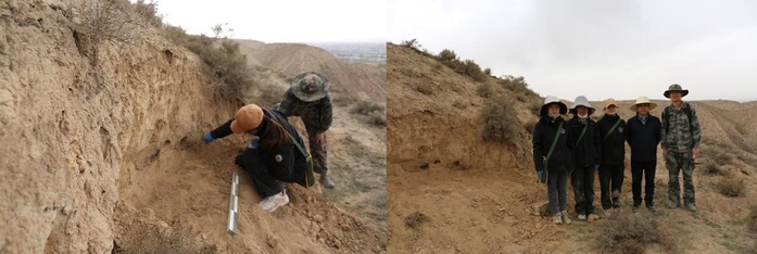 4月9日至14日,团队在永登县境内史前遗址进行考察。选址集中于庄浪河两岸阶地,选取汪家湾、塘土湾、薛家坪、李家坪、凤凰山等十余处新石器时代遗址,在台地及坡面展开田野考察,发现墓葬、文化层等遗迹。考察过程中,慕占雄老师依托各遗址展开田野考古实践教学,除了基本的遗迹遗物辨认、数据测量与记录外,还引导团队成员关注遗址四周环境与地貌、墓葬朝向等信息,形成对人类生活方式、社会结构的立体认识。