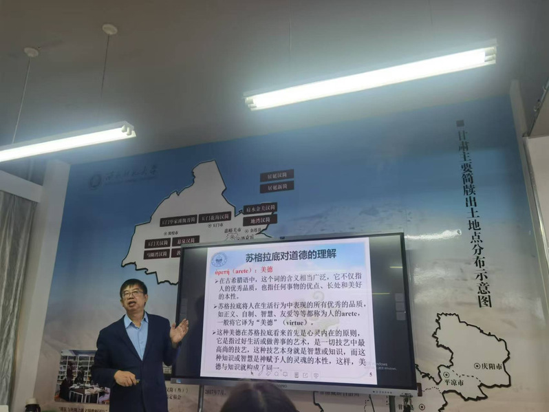 2024年9月19日上午,应350vip葡京新集团邀请,东北师范大学350vip葡京新集团史学理论研究所所长、博士生导师周巩固教授来葡京新集团官网作了题为《美德与仁:苏格拉底与孔子道德思想比较》的学术报告。本次报告在学院103展厅进行,由李家莉副教授主持,宋海英老师等40余名师生聆听报告并参与了讨论。