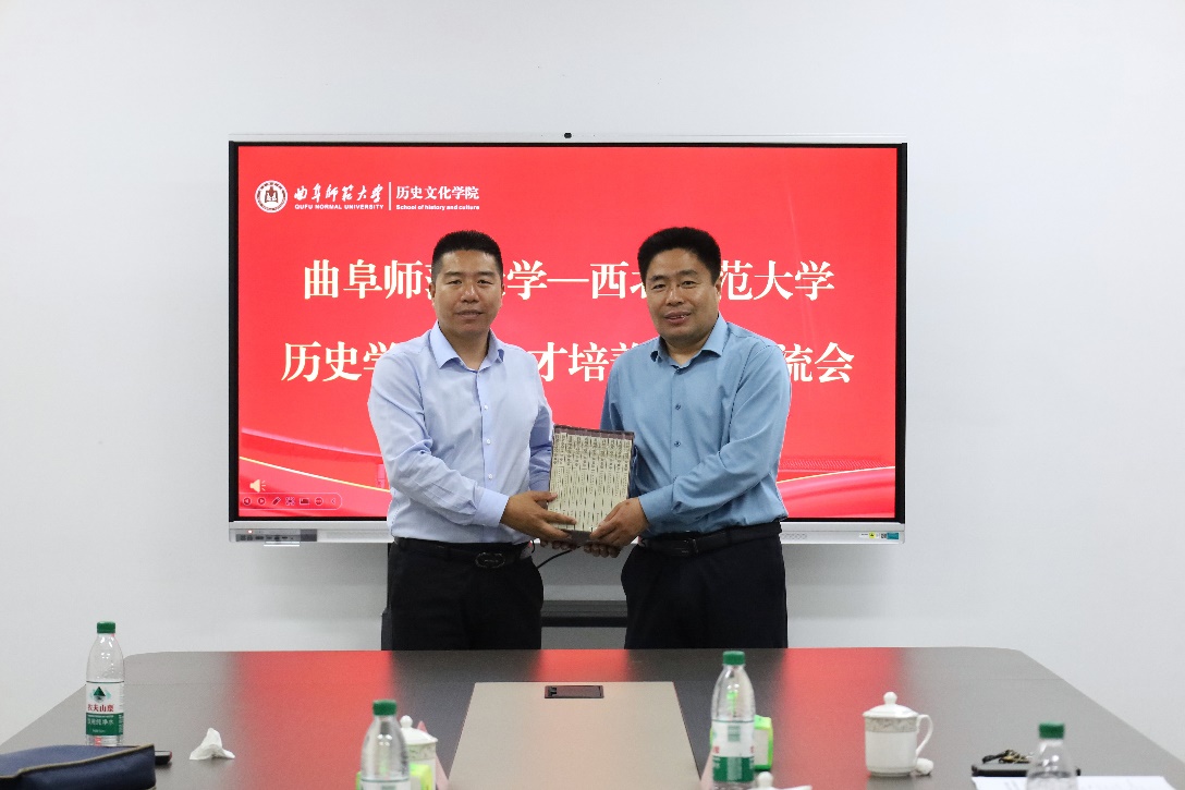 之后,双方就本科课程设置、学风建设、教育实习、考研升学等方面展开了深入交流。会议结束,张继刚向曲阜师范大学350vip葡京新集团赠送《简牍学研究》书籍,期待今后双方进一步加强交流合作,相互学习,促进共同发展奠定基础。