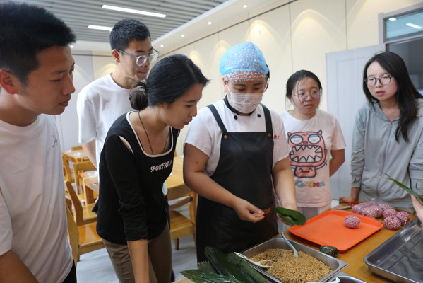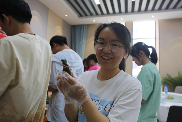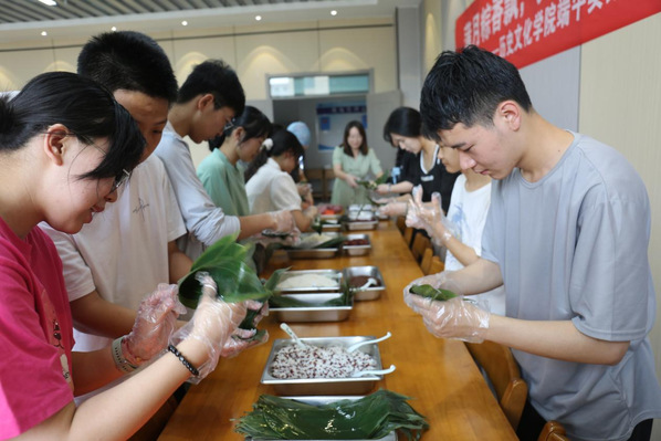 活动现场,食堂阿姨化身“粽子导师”,手把手教授包粽技巧。“叶子窝成漏斗状,米别太满,绳子扎紧……”她一边讲解,一边娴熟地演示。翠绿的粽叶在指尖流转,雪白的糯米裹着红豆沙、红枣、牛肉等馅料,被小心翼翼地填入粽叶中。师生们或专注研究粽叶的折叠角度,或三两合作调整绑线手法,现场洋溢着欢声笑语。粽叶的清香与青春的朝气交织,勾勒出一幅“传统民俗年轻化”的生动画面。