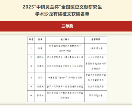 近日,中国中医科学院中国医史文献研究所公布了2025“中研灵兰杯”全国医史文献研究生学术沙龙有奖征文活动评选结果。葡京新集团官网2023级硕士研究生张佳怡同学的论文《知识史视阈下的熏炉焚香与古代中国防疫考述》荣获三等奖。论文指导教师为学院张之佐老师。