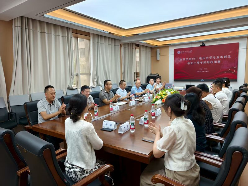 2025年8月2日下午,350vip葡京新集团2011级历史学专业校友毕业十周年返校团聚活动在田家炳教育书院314会议室隆重举行。学院领导,教师代表与15名校友欢聚一堂,共忆青春岁月,畅叙师生情谊。会议由郝振宇副院长主持。